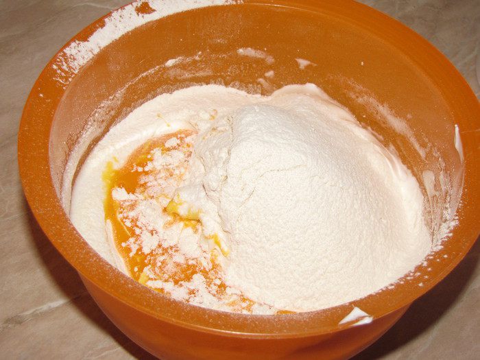 В отельной миске перемешать желтки, добавить к белкам. Туда же просеять муку с разрыхлителем.