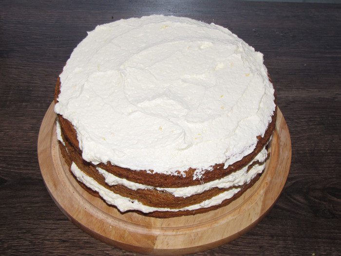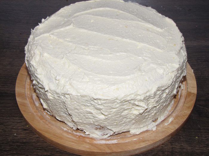 Бока торта так же обмазать творожным кремом.