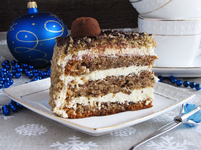 Нежный ореховый бисквит, пропитанный сиропом с добавлением апельсинового ликера. Творожный крем с легкой цитрусовой ноткой. Ореховая крошка, немного шоколада и трюфельные конфеты для украшения.
