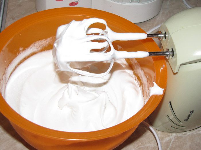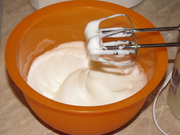 Тонкой струйкой ввести сахар вместе с ванильным сахаром и продолжать взбивать. Белки взбились, если из перевернутой миски ничего не выпадет.