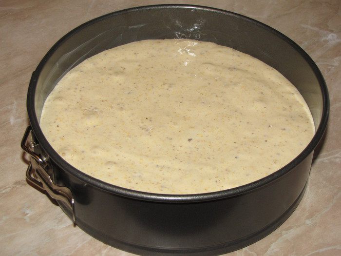 Разъемную форму диаметром 20 см смазать сливочным маслом и вылить тесто. Тесто очень нежное и воздушное. Пару раз прокрутить форму вокруг своей оси, чтобы тесто легло ровнее. Духовка к этому времени должна быть уже прогрета до 180°С. Выпекать бисквит 30-35 минут.