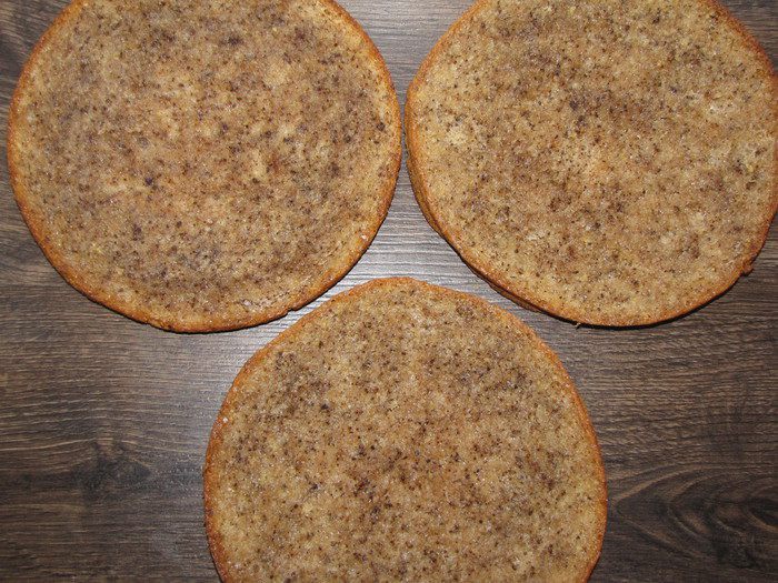Разрезать бисквит на три равные части.