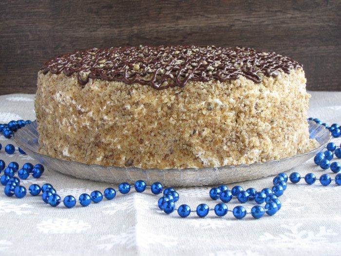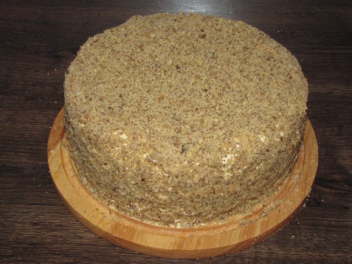 Верх и бока торта обсыпать ореховой крошкой.