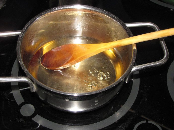 Приготовим сироп для пропитки бисквита. Влить в сотейник или маленькую кастрюльку воду, дать закипеть. Всыпать сахар, убавить огонь и поварить минуты три, помешивая. Убрать сотейник с огня, добавить 2 ст. л. ликера. Сироп остудить.