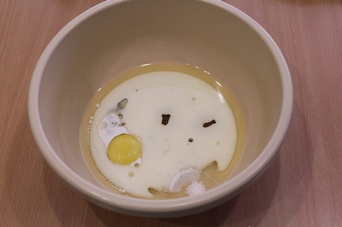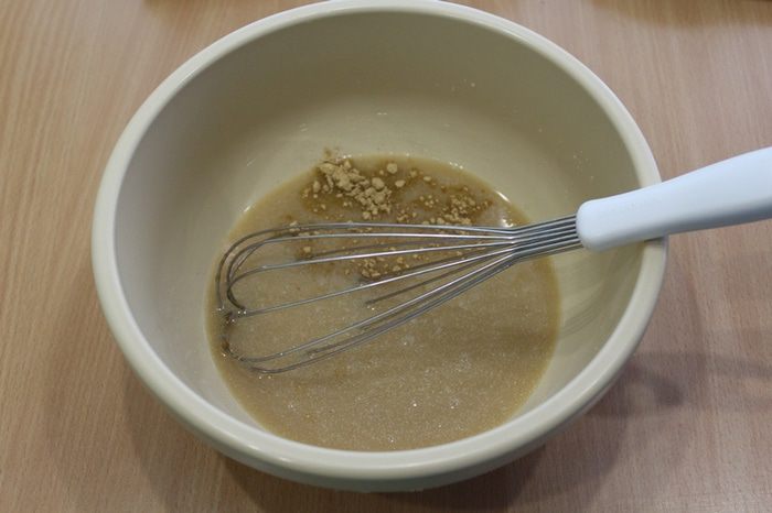 Смешать молоко, растительное масло, яйцо, щепотку соли, мёд и сахар до однородности.