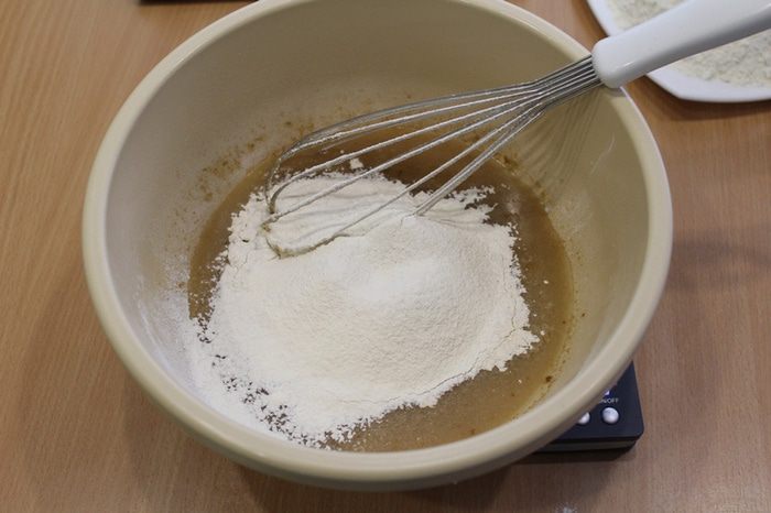 Затем просеять часть муки с содой и разрыхлителем, затем остальную муку(возможно понадобиться чуть меньше).