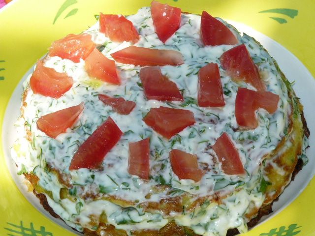 Перемазать коржи, сложить друг на друга. В качестве начинки можно использовать помидор, тертый или плавленный сыр (но это необязательно, по желанию).