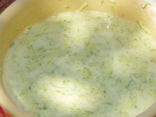 Яйца взбить с двумя ст. ложками майонеза, добавить муку и соду. Перемешать. Кабачки отжать, добавить к яичной массе, перемешать.