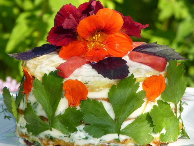 Украсить зеленью. Я использовала петрушку, базилик и цветы настурции, они тоже съедобные.