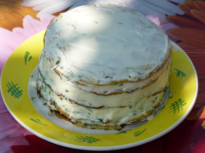Бока и верхушку промазать майонезом. Готовый «тортик» охладить минут 15 — 20 в холодильнике.