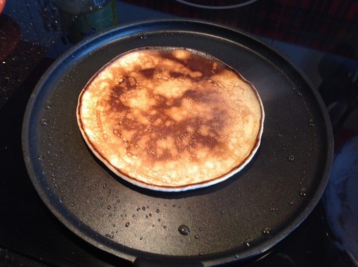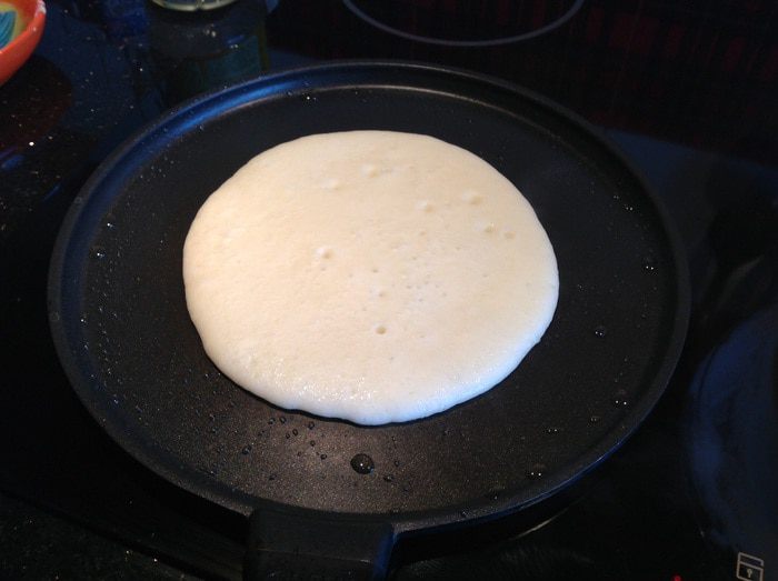 Разогрейте сковороду для блинов, слегка смажьте растительным маслом. Большой ложкой или половником вылейте тесто на раскаленную сковороду, жарьте с одной стороны 3 минуты.