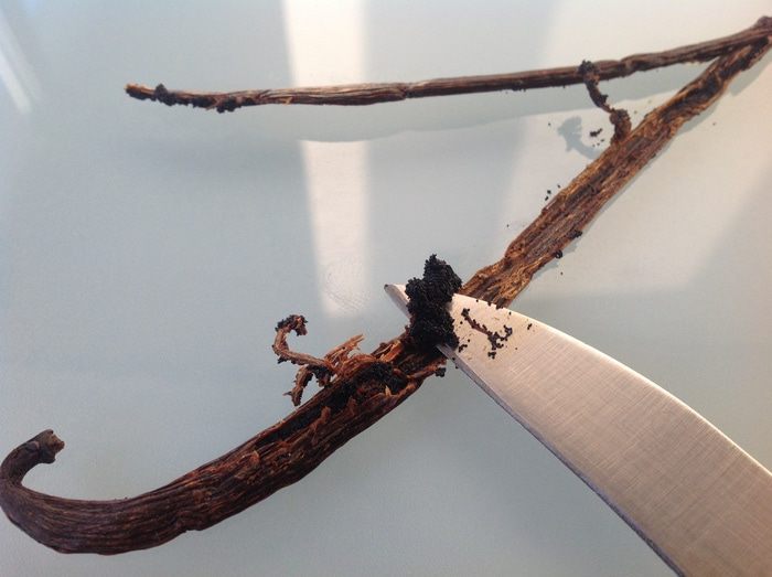 Стручок ванили разрежьте пополам и выскребите ножом семена, добавьте в молоко и, помешивая, подогревайте ещё 2-3 минуты, потом стручок ванили извлеките, молоко немного остудите.