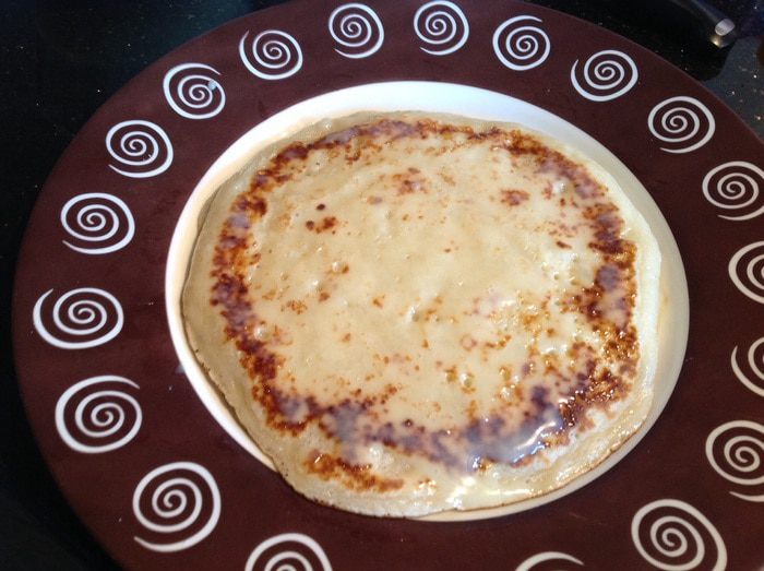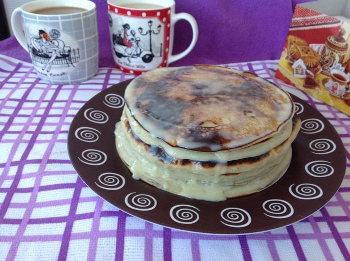 Складывайте панкейки стопочкой на тарелку, промазывая сгущенным молоком.