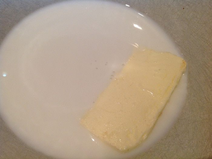 Налейте в небольшую кастрюльку молоко, добавьте сливочное масло и подогревайте до тех пор, пока масло не растопится.