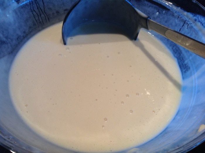 Вылейте молочную смесь в мучную и перемешайте до однородности.