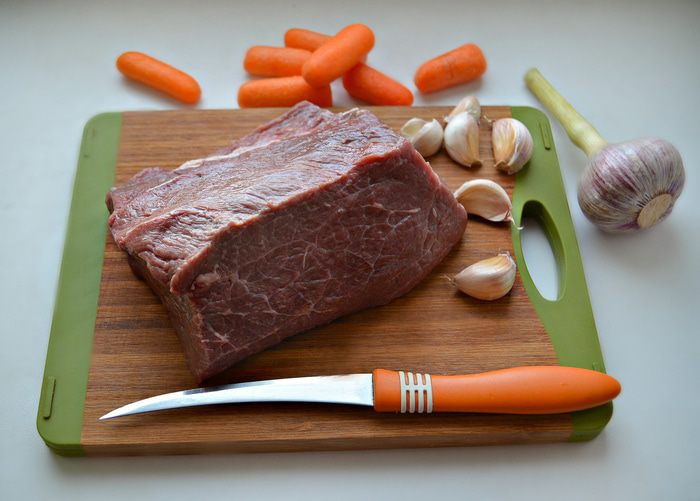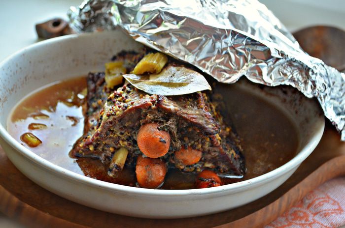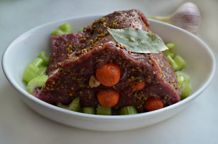 Посолите говядину и натрите перцем и горчицей. Затем с помощью ножа сделайте надрезы и нашпигуйте мясо дольками чеснока и морковью. Уложите мясо в форму, смазанную растительным маслом. Вокруг уложите нарезанные кусочки сельдерея, лавровый лист. Накройте кусок мяса фольгой и запекайте в разогретой до 170°С духовке около 1,5 часов, периодически поливая мясо выделившимся соком.