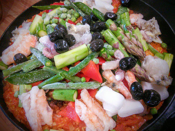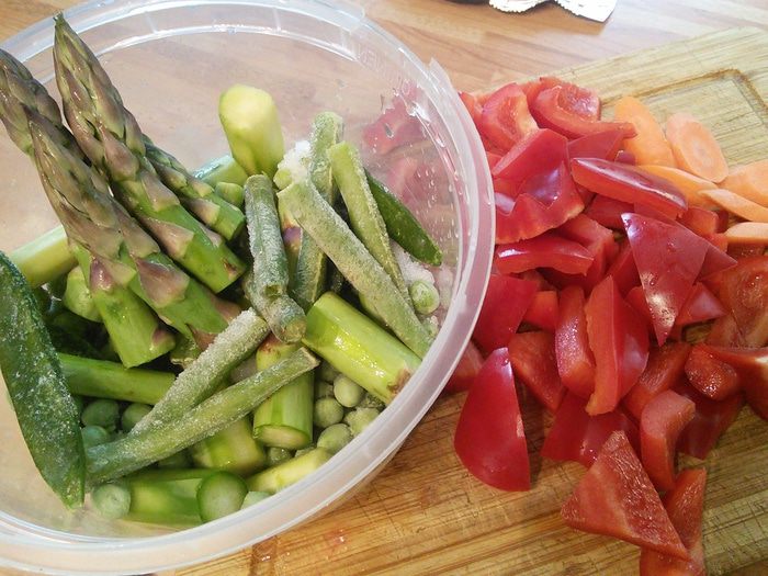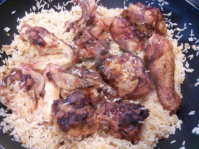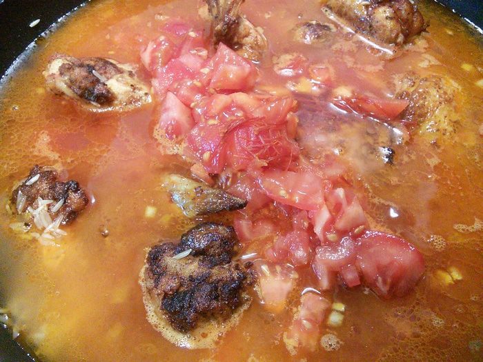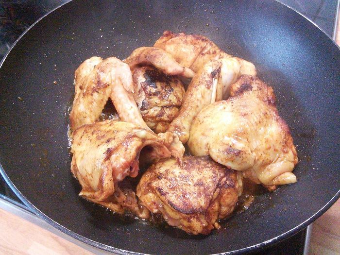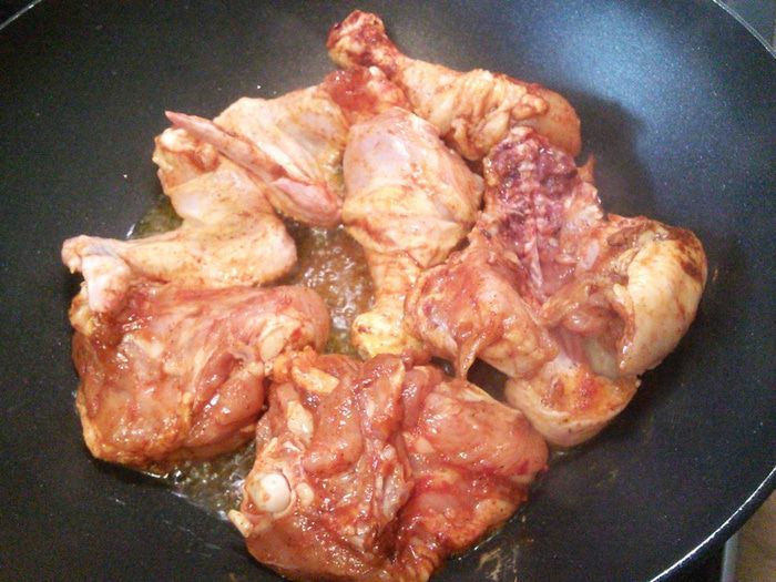 Замаринуем куриное мясо. Я разделала тушку курицы на порционные кусочки. В ход пошло все мясо, кроме филе (которое я сняла с остова, из которого с добавлением луковички, морковки и сельдерея сварила 1,5 литра бульона). Итак кусочки курицы смешать с солью, перцем и порошком красной сладкой паприки и оставить на несколько часов мариноваться.