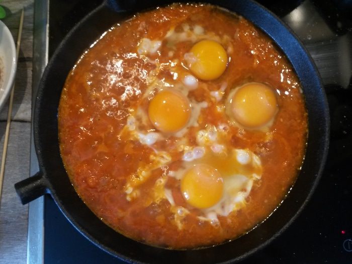 В готовый соус разбиваем яйца, солим. Готовим до готовности белка. У меня яйца деревенские, бабушкины, поэтому сырой желток едим смело.