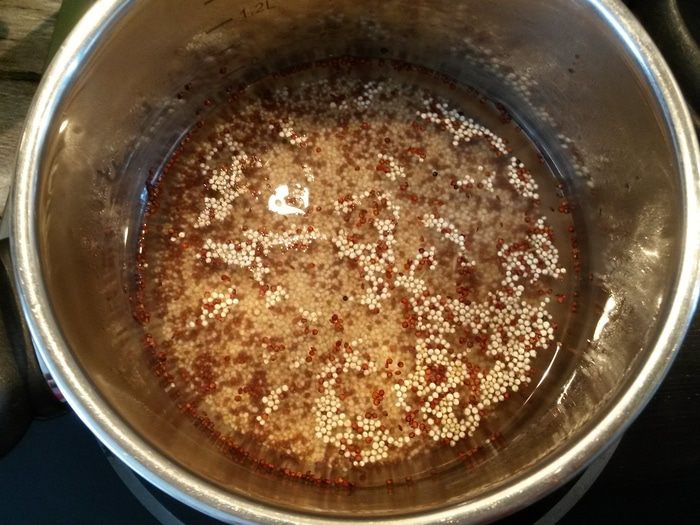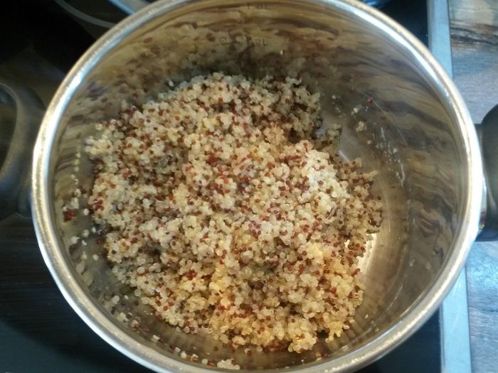 Готовим киноа согласно инструкции. Я беру 1 стакан воды на 1/2 стакана киноа и готовлю на медленном огне 15 минут.