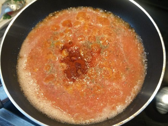 Добавляем томатный соус к луку. Добавляем тимьян, парику, соль. Выпариваем соус до нужной консистенции.