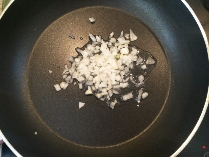 Лук нарезаем мелким кубиком и слегка обжариваем в небольшом количестве растительного масла.