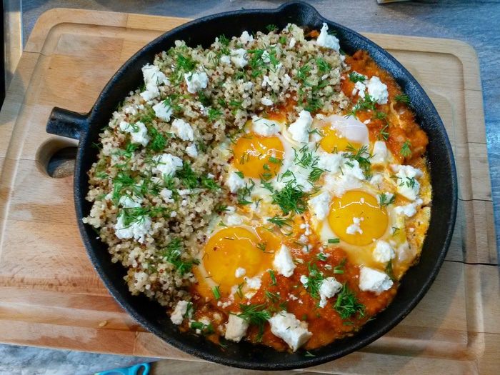 Соус с яйцами немного сдвигаем лопаткой. Выкладываем киноа. Сверху все посыпаем брынзой и укропом.