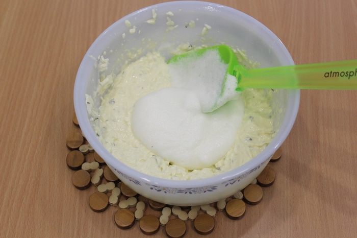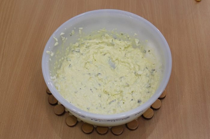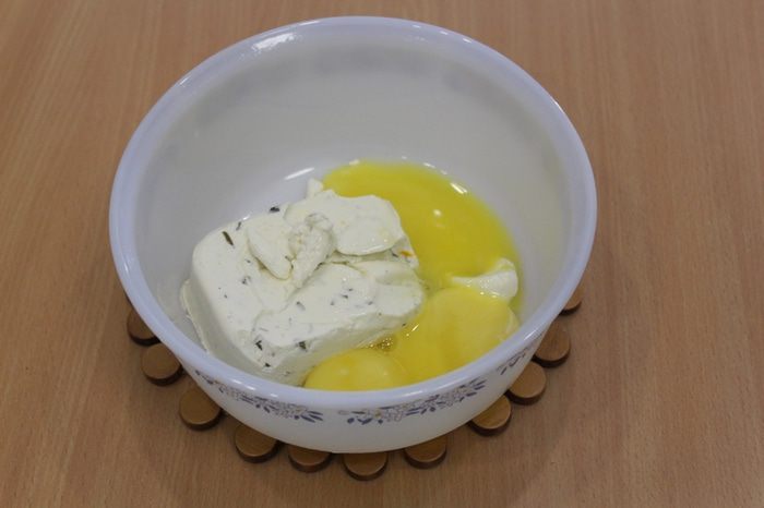 Творожный сыр (у меня с укропом) взбить с тремя желтками.