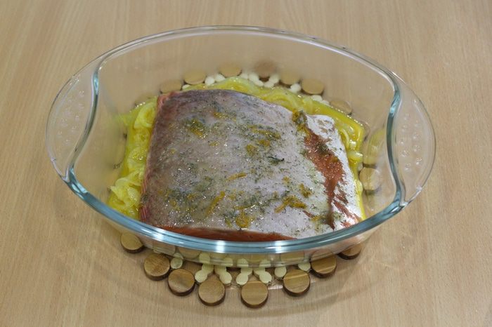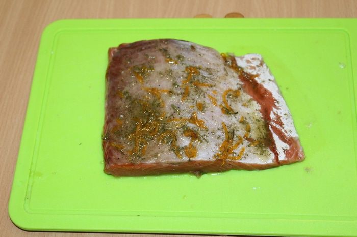 Приготовить все для маринада, смешав все ингредиенты, намазать этой смесью рыбу, завернуть в пленку и убрать в холодильник на 30 минут.
