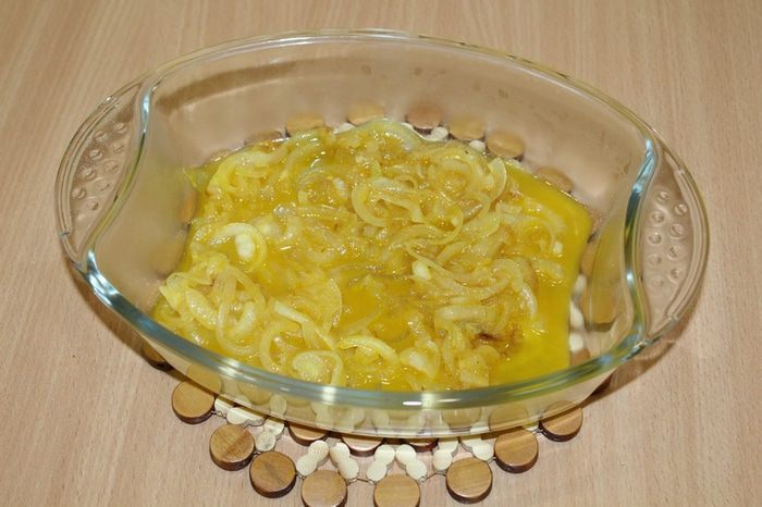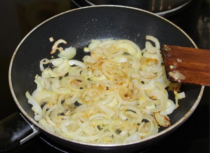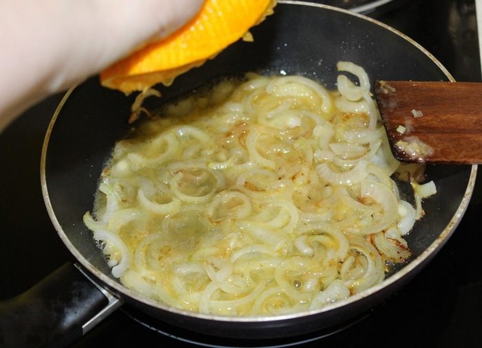 В это время, пока маринуется рыбка, нарезать лук полукольцами и обжарить на сливочном масле до золотистого цвета.