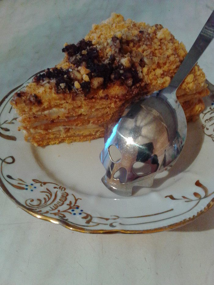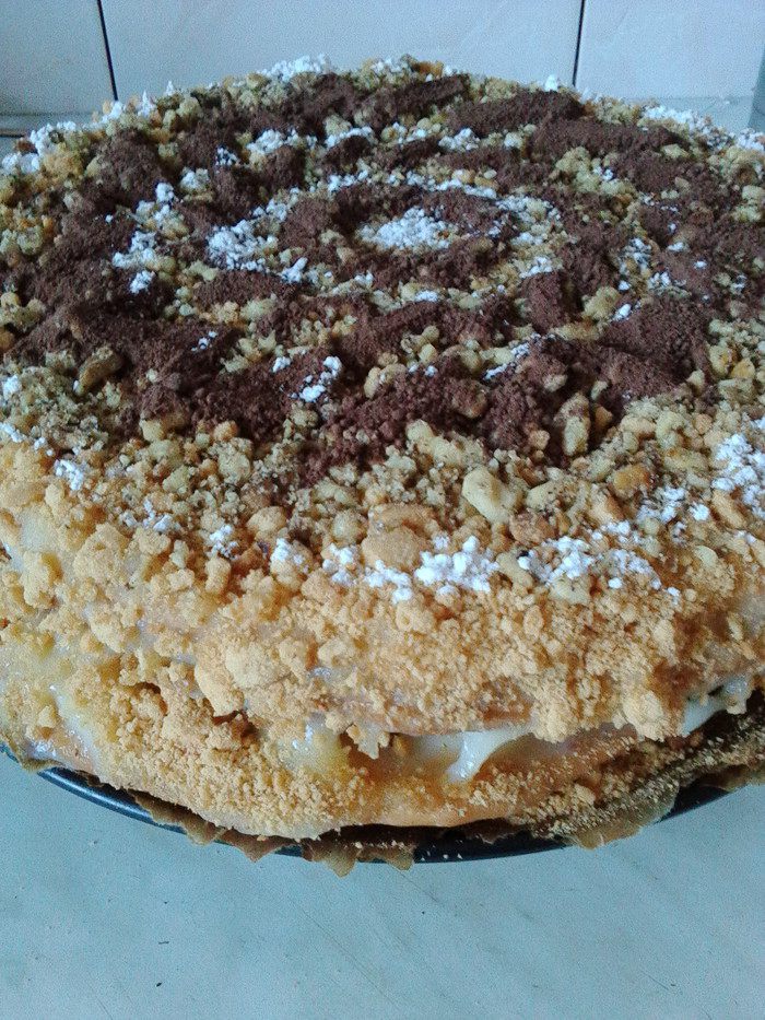 Когда все коржики уже готовы, делаем крем. Автор использовал смесь 400 г сметаны и 600 г сгущенки. А я сварила обычный заварной крем и горячим перемазала коржи. Для этого соединила яйцо, сахар, ваниль с мукой и крахмалом. Эту смесь залила 200 г холодного молока, смешала до однородности. В сотейнике предварительно нагрела оставшиеся 300 г молока, добавила холодную мучную смесь, прокипятила 1-2 минуты, добавить масло, всё чуть взбить. Для эксперимента два коржа намазала смесью сметаны и жидкого мёда 1:1, пропитались одинаково хорошо, как с заварным кремом, так и сметанно-медовым. Можно использовать один заварной крем, добавив в него мед. Пробуйте на свой вкус.