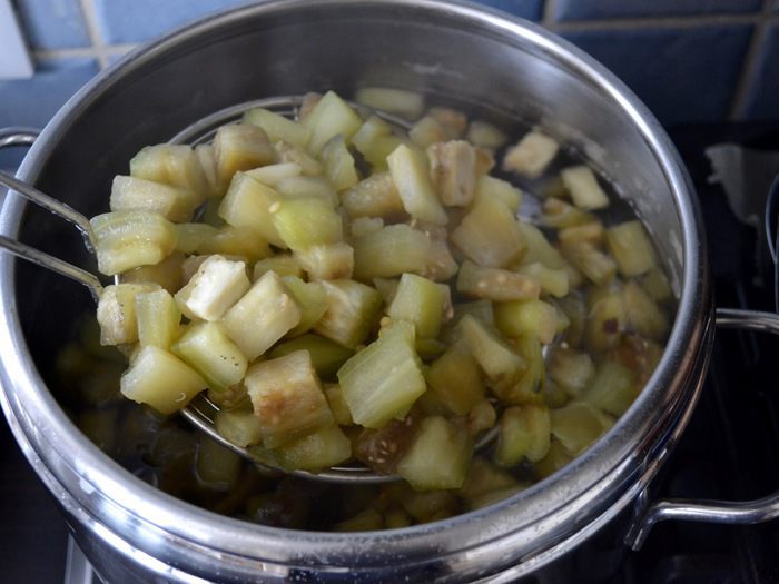 Баклажаны очистить от кожуры и нарезать кубиками (если предпочитаете более выраженный вкус, оставьте немного кожуры). Отварить 15 минут в подсоленной воде. Достаньте баклажаны шумовкой из воды и остудите.