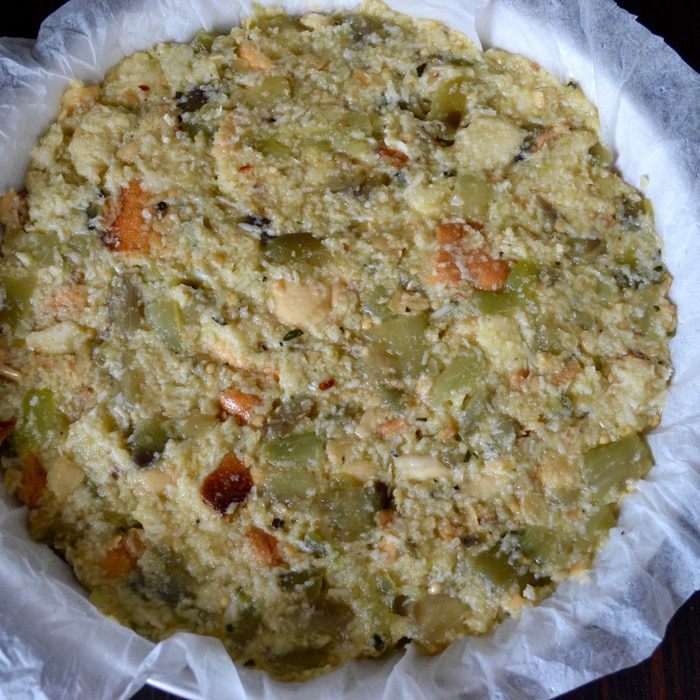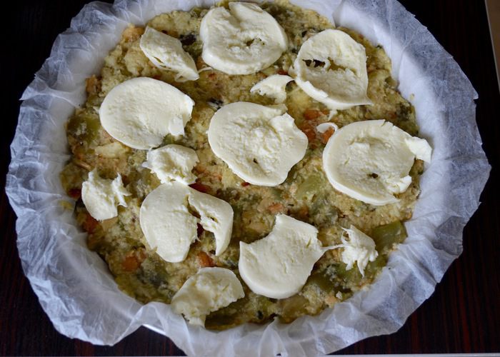 Выложить все в форму для выпечки (24 см диаметром) и разровнять. Сбрызнуть оливковым маслом.