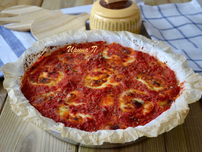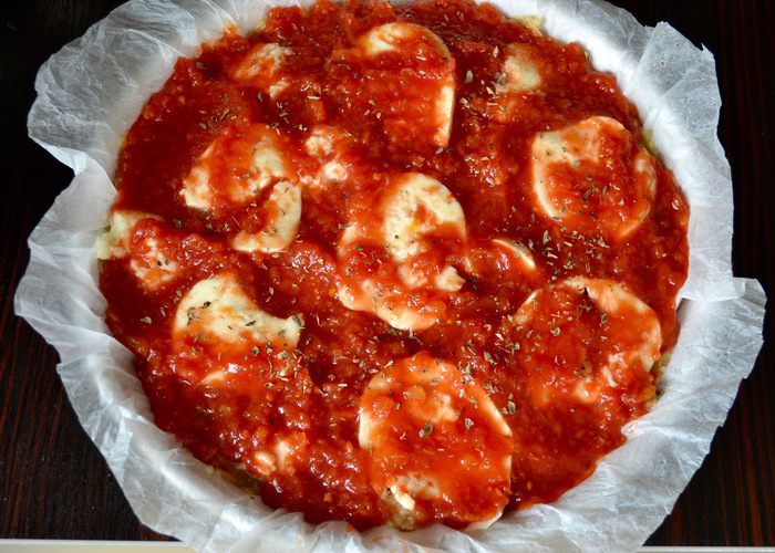 Затем смазать все обильным слоем протертых томатов (пассатой из помидоров) и присыпать орегано. Выпекать в разогретой до 180°С духовке 30 минут.