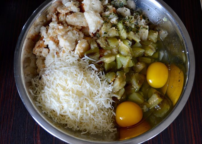 Выложить в миску баклажаны, тертый сыр пармезан (или грана), замоченный предварительно в воде хлеб (лучше всего домашний!) и базилик. Посолить по вкусу! Перемешать тщательно все ингредиенты!
