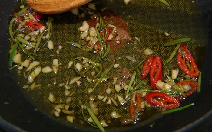 Добавить к чесноку листья розмарина (немного оставить), перец чили и анчоусы, все перемешать, влить оставшееся оливковое масло и слегка прогреть все вместе на медленном огне.