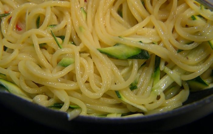 Готовые спагетти выложить в сковороду с чесноком и анчоусами, добавить цукини, все перемешать и еще немного прогреть.