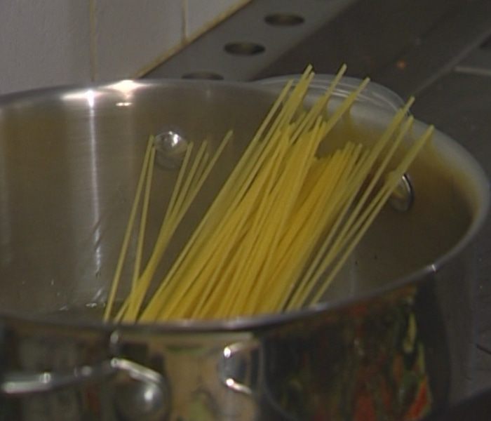 Спагетти отваривать в подсоленной воде на минуту меньше, чем указано на упаковке, затем воду слить, немного сохранив.