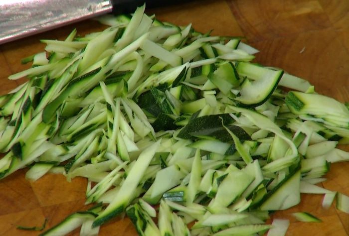 Цукини вместе с кожурой настругать тонкими длинными полосками (можно воспользоваться овощечисткой), затем порезать тонкой соломкой.