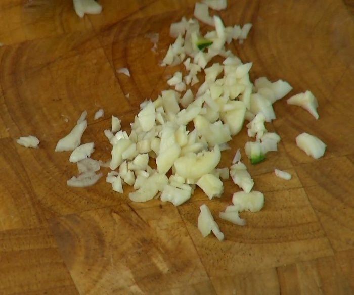 Чеснок почистить, раздавить плоской стороной ножа и мелко порубить.