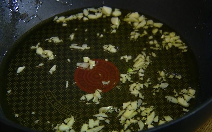 Разогреть в тяжелой глубокой сковороде 2 ст. ложки оливкового масла и обжарить чеснок до прозрачности.