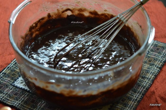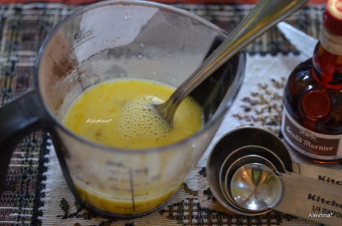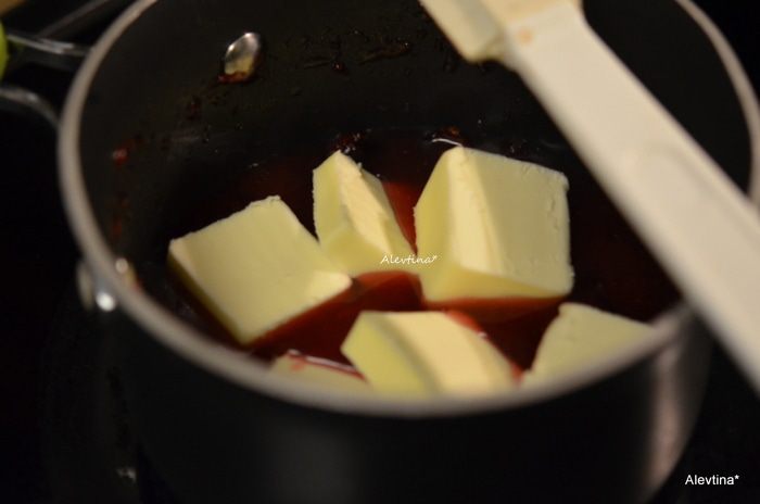 Переложить в небольшую кастрюльку, добавить масло и воду и готовить, помешивая на среднем огне. Довести до кипения, снять с огня и добавить апельсиновый ликер или натуральный апельсиновый сок.
