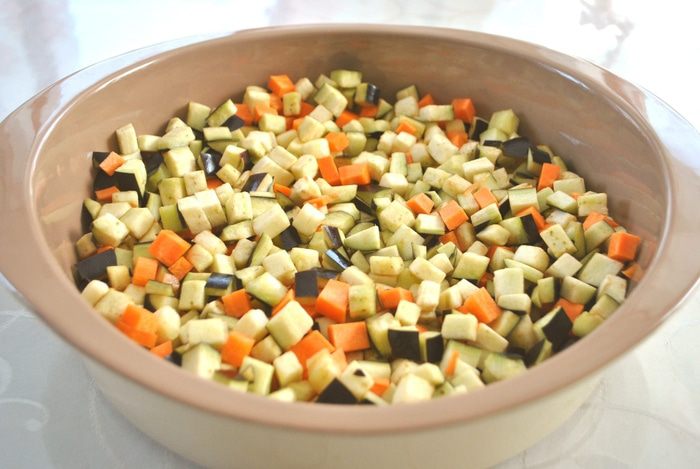 баклажаны с морковью режем кубиками 1х1 см. Смешиваем с маслом. Отправляем в разогретую до 180°C духовку. Примерно через 10 мин. духовку открыть и перемешать овощи.