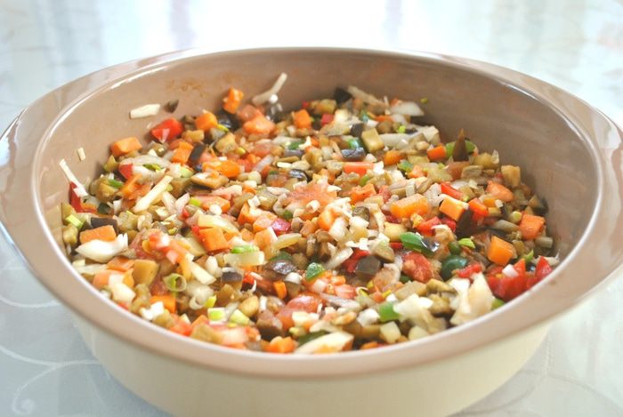 Через 20 мин. добавляем репчатый лук, перец сладкий, чеснок, помидоры (снять шкурку) — все мелко порезано. Тщательно перемешиваем. Я не солила, вы можете посолить. И отправляем в духовку еще на 20 мин., через 10 мин. помешать.