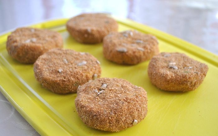 Смешиваем отруби или панировочные сухари, манку, муку с семечками. Панируем котлеты. Жарим на среднем огне в минимальном количестве масла.