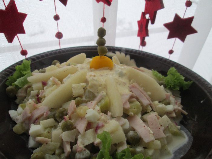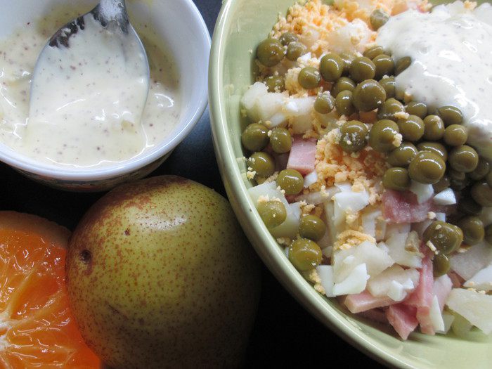 Огурцы очищаем от кожицы, нарезаем кубиками, щедро солим, выкладываем в дуршлаг и оставляем на время — даем воде стечь. Груши необходимо очистить от кожуры и нарезать кубиками или соломкой, полить апельсиновым соком. Под соком они не потемнеют и приобретут новый вкус. Нарезать все остальные ингредиенты и смешать с приготовленной заправкой.
