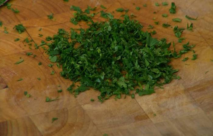 Листья петрушки мелко порубить и смешать с чесноком.