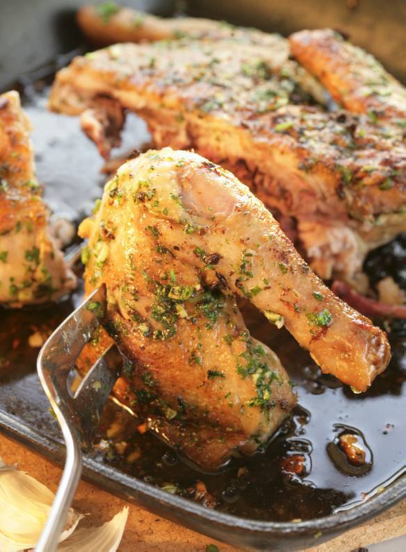 Разогреть в небольшой кастрюле 2 ст. ложки оливкового масла, добавить оставшуюся петрушку с чесноком, посолить, поперчить и слегка прогреть на медленном огне, а затем полить готового цыпленка.