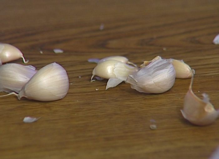 Чеснок почистить, выложить в маленькую кастрюлю, залить холодной водой, довести до кипения и варить 2 минуты, затем чеснок вынуть и растереть.