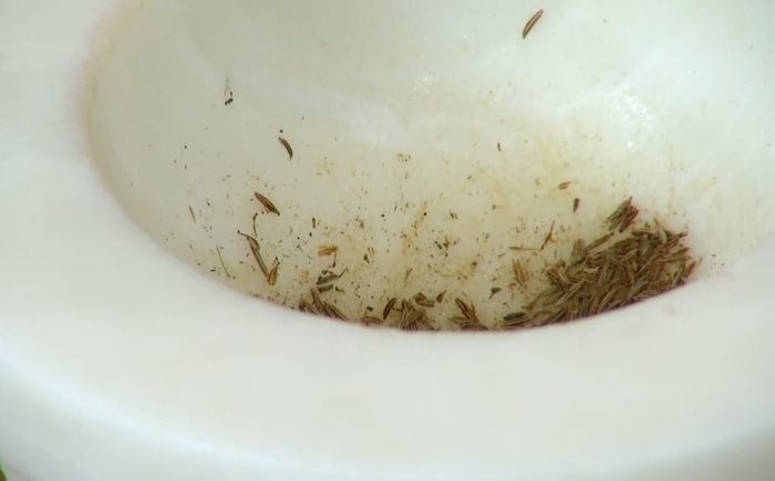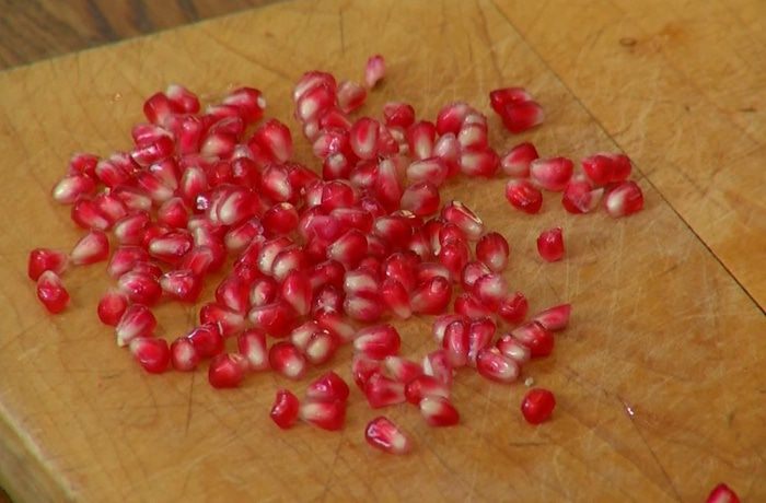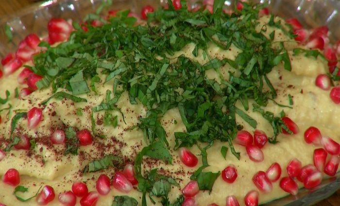 Готовое пюре выложить в блюдо, посыпать зернами граната, измельченным базиликом и сумахом.