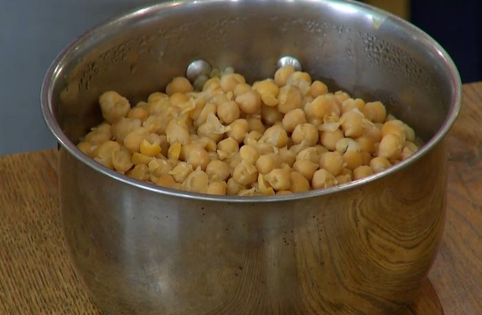 Нут замочить на ночь, затем отварить согласно инструкции на упаковке без добавления соли.